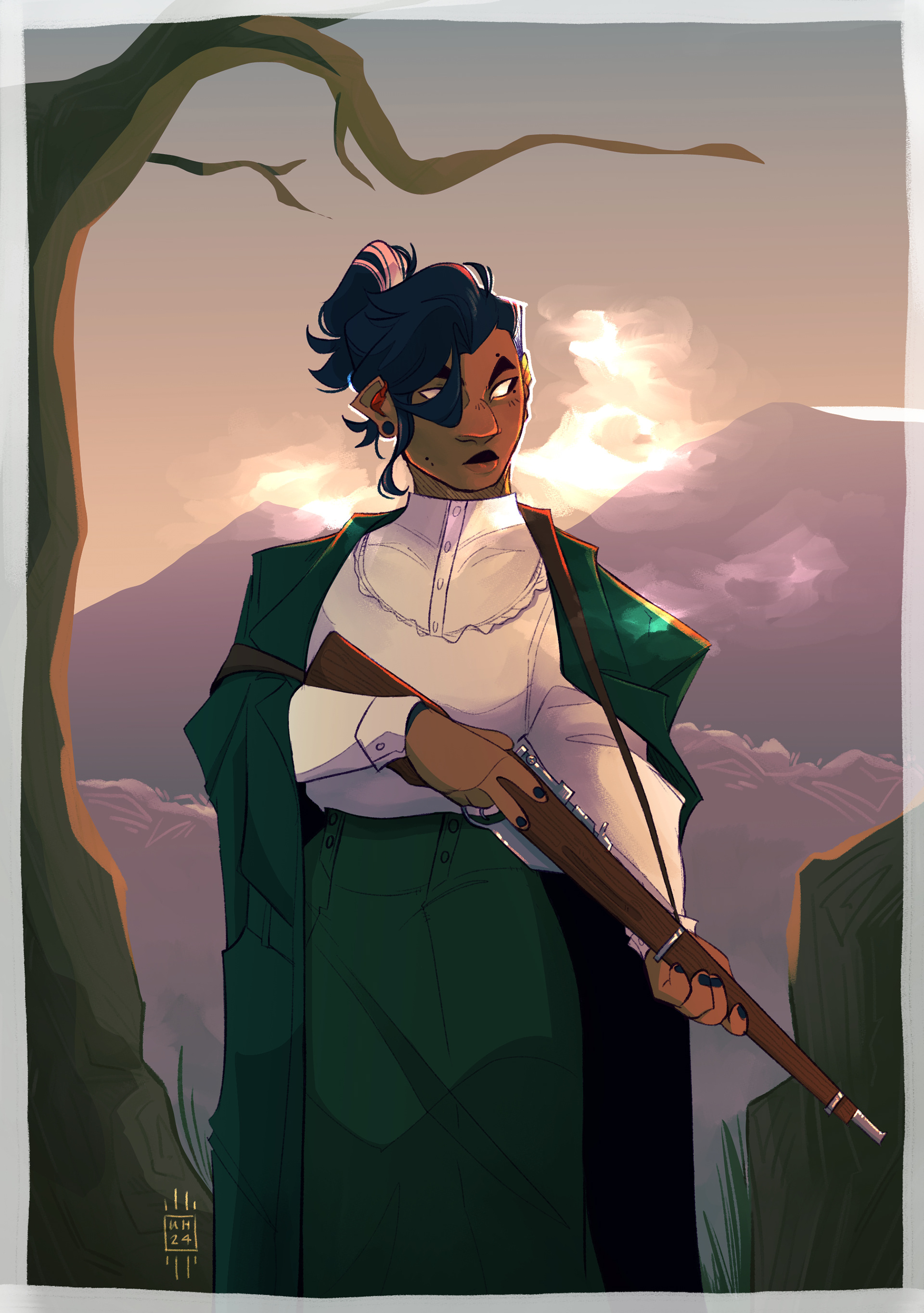 Splash art for Echo, a D&D 5e character, as a visual for her first appearance in a new campaign.